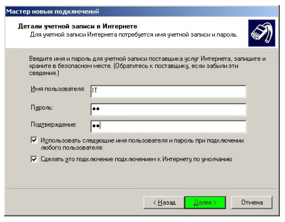 7. В следующем шаге необходимо ввести имя пользователя и пароль, необходимые для доступа к сети.