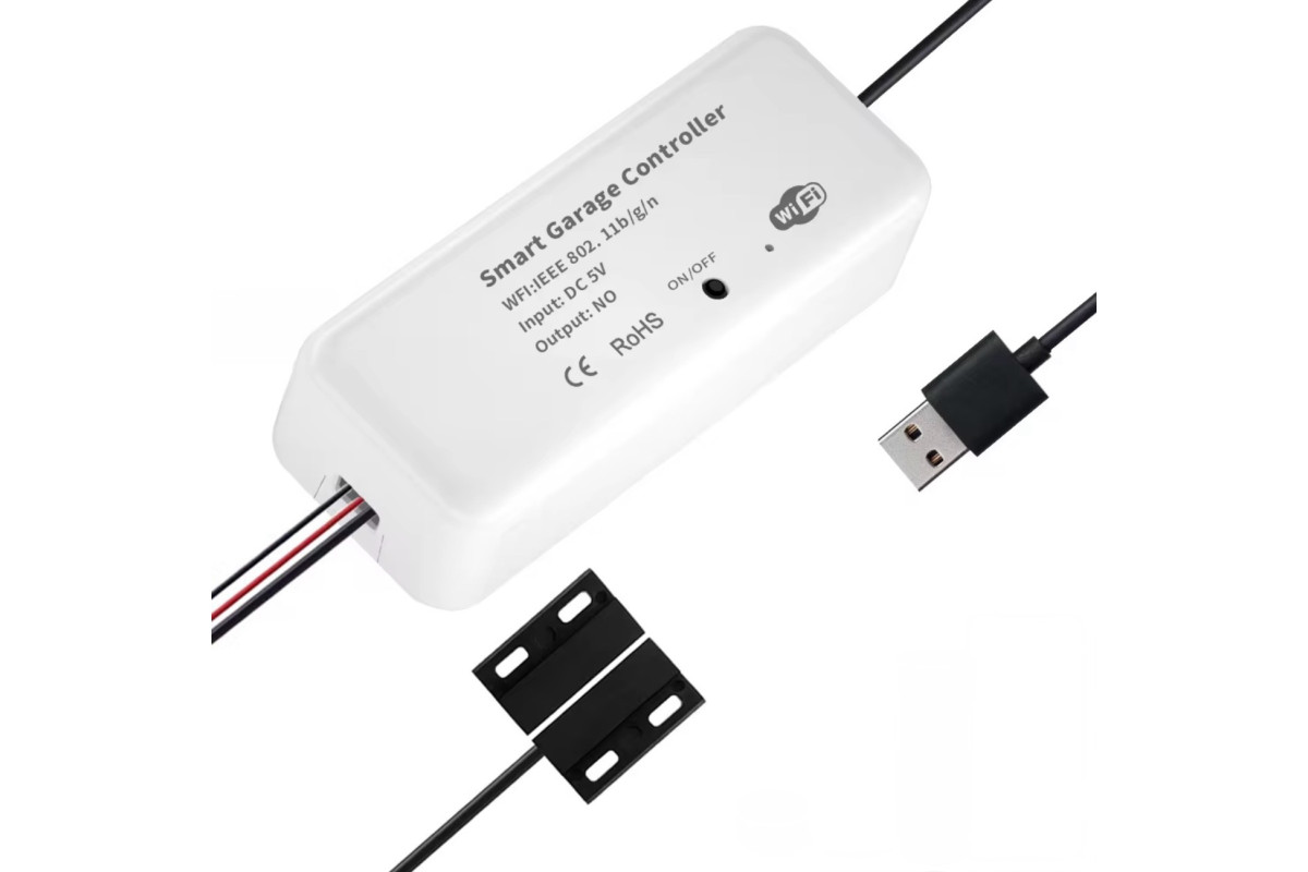 Контроллер подключается по Wi-Fi 2.4 ГГц (не поддерживает 5 ГГц) и совместим с Android и iOS. В комплект входит сенсор с кабелем длиной 5 м, который точно определяет состояние ворот (открыто/закрыто) с расстоянием срабатывания до 30 мм. Корпус изготовлен из огнестойкого ABS-пластика для безопасного использования.
