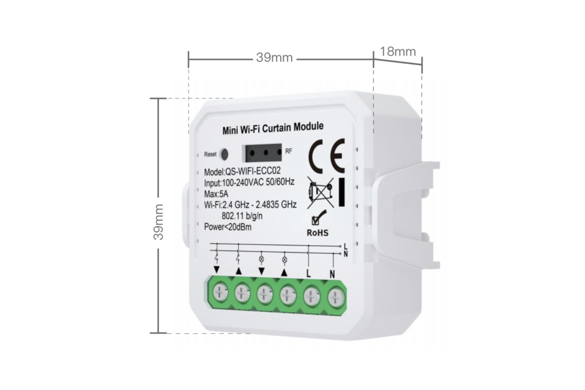 Умный выключатель для штор QS-WIFI-ECCO2 — это компактное устройство, которое позволяет удобно управлять шторами или жалюзи через систему умного дома. Благодаря поддержке приложений Tuya Smart или Smart Life управление шторами становится максимально простым — через смартфон или голосовых помощников.